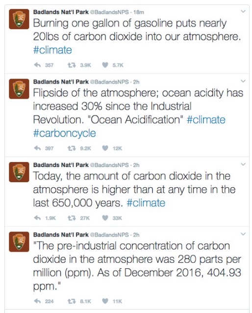 “The Badlands National Park tweets come after Trump’s administration enforced a social media blackout on the Environmental Protection Agency, barring EPA staff from publishing news releases, blog posts or social media updates. The rules also barred EPA staff from awarding new contracts or grants.” More here: