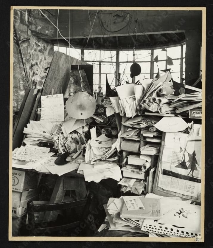A close friend sent me this image and article on creative workspaces of the famous. I like how the boxes underneath the table appear to be holding it up! What I find so fascinating though is that Calder’s structures exemplify this beautifully balanced minimalism and yet his space appears to be the antithesis of his art.
