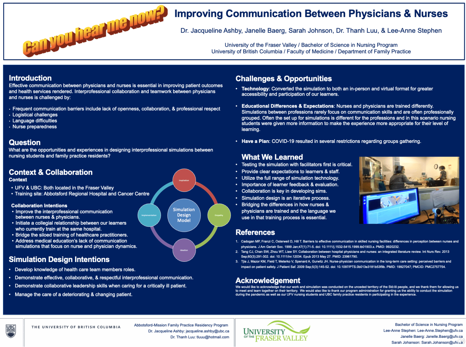 Interprofessional simulation is one of the most effective ways to strengthen team-based care. In 2020, through the British Columbia Simulation Network, I connected with Lee-Anne Stephen, Associate Professor and Director of the School of Health Studies at UFV, and together we launched an interprofessional simulation project bringing together the UBC Family Practice Residency Program and UFV’s Nursing Program.