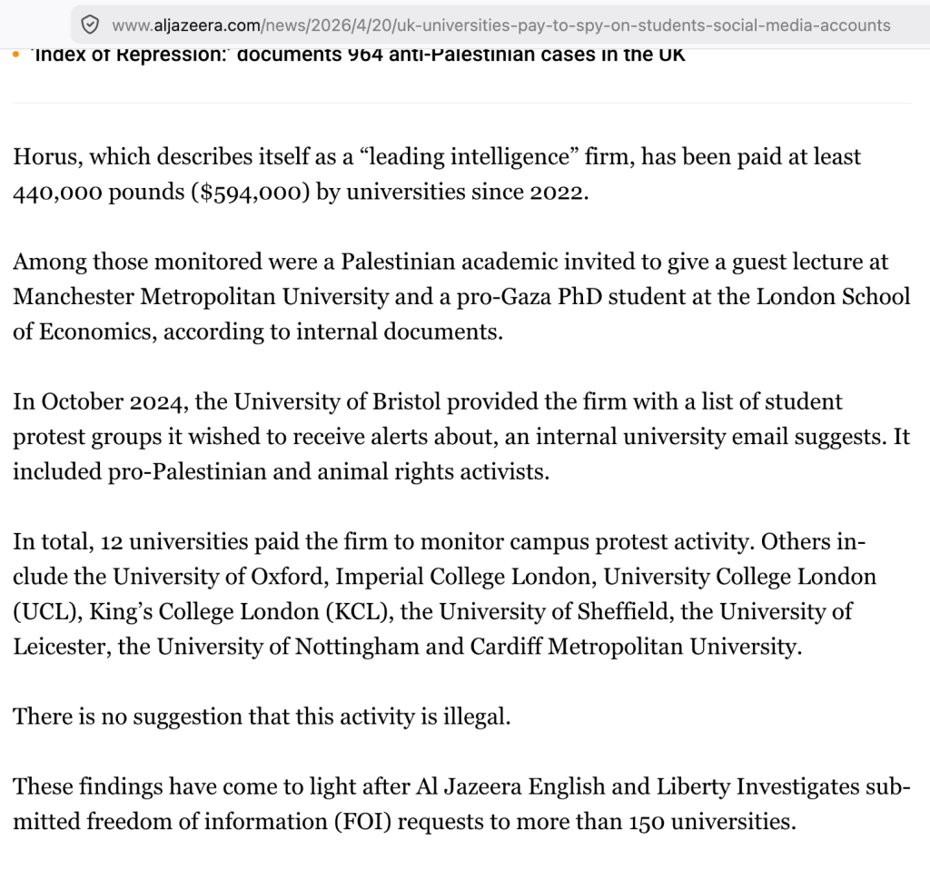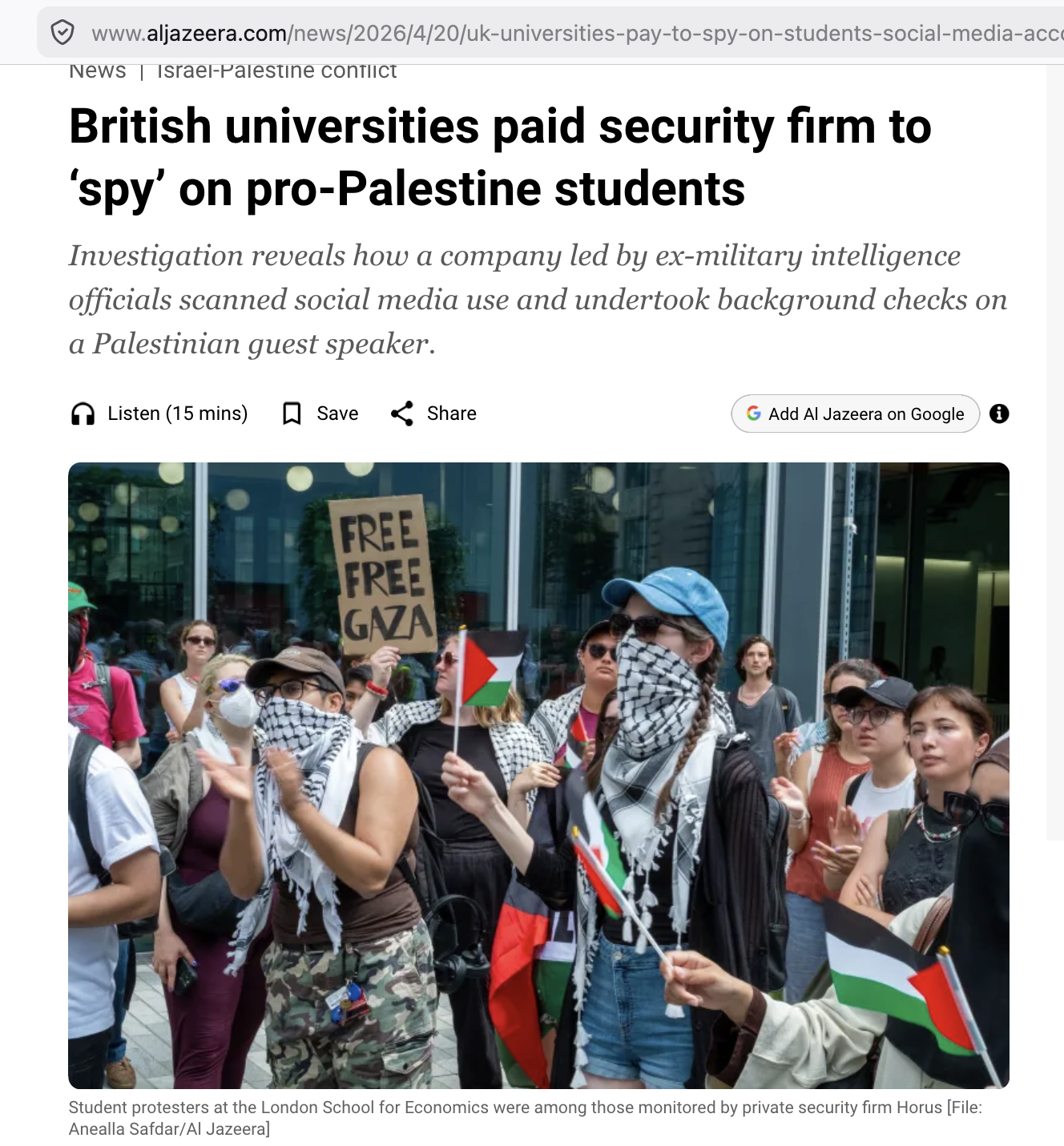 Learn more here: British universities paid security firm to ‘spy’ on pro-Palestine students. Investigation reveals how a company led by ex-military intelligence officials scanned social media use and undertook background checks on a Palestinian guest speaker: https://www.aljazeera.com/news/2026/4/20/uk-universities-pay-to-spy-on-students-social-media-accounts.