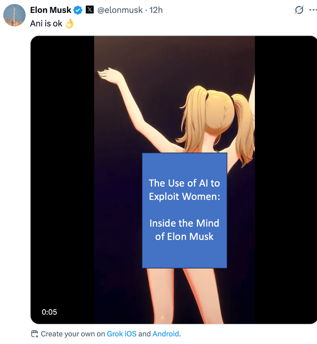 Since Elon Musk’s release of “spicy” mode on X, I’ve observed a dramatic increase of deepfake sexual images of women being used on his platform for a variety of purposes. Whether it’s a doctored image of Taylor Swift or someone else’s daughter, the fact that Elon Musk’s AI platform is encouraging the generation of non-consensual deepfakes and branding it as “spicy mode” or “creative” is both incredibly disturbing and revealing about the man. It shows us exactly where Musk’s head is at: a Jeffrey Epstein–like mindset where women’s dignity is disposable, and profit is the name of the game.