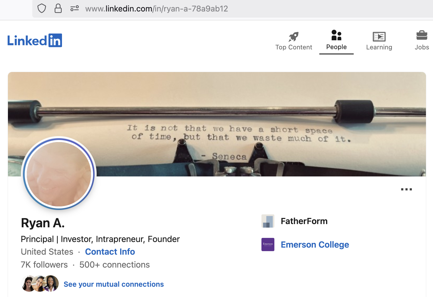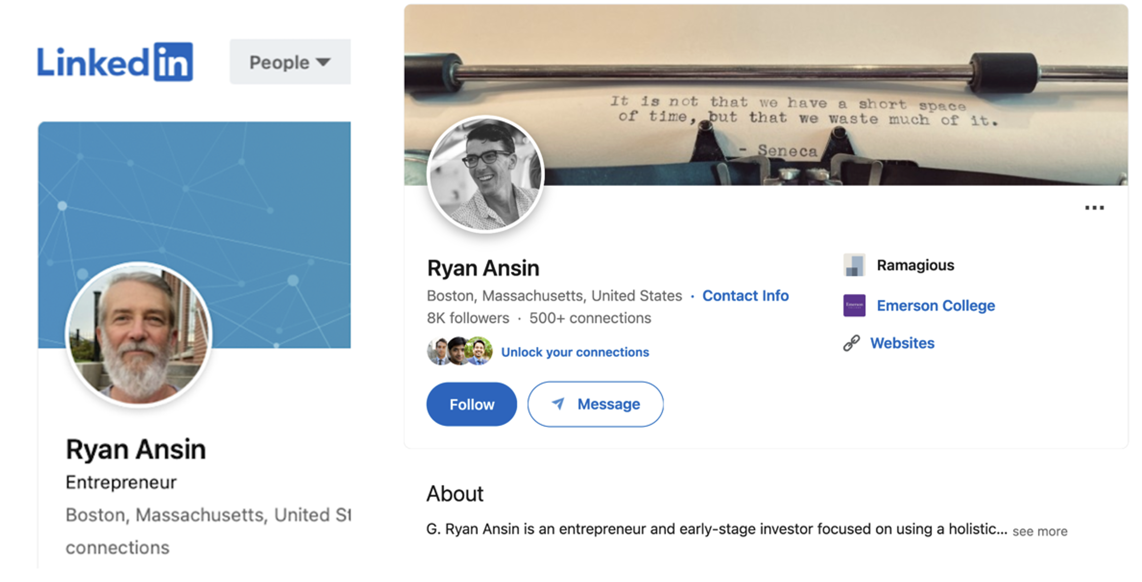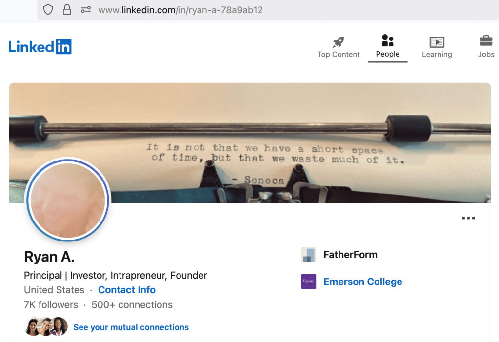 Another element that added to my concern was the shifting nature of Mr. Ansin’s LinkedIn presence. Over time, I observed multiple changes to his profile picture, displayed name, and account details. For example, screenshots captured at different times show variations in how his name appeared and how the profile was presented. In a recorded interview with Talking Hedge (published April 27, 2022), Mr. Ansin commented on his own LinkedIn presence at approximately the 37:03 mark, stating: “I have a grizzly old beard on LinkedIn because it miss[es] the people that reach out to me by about 50%. And so don’t be fooled by that.”