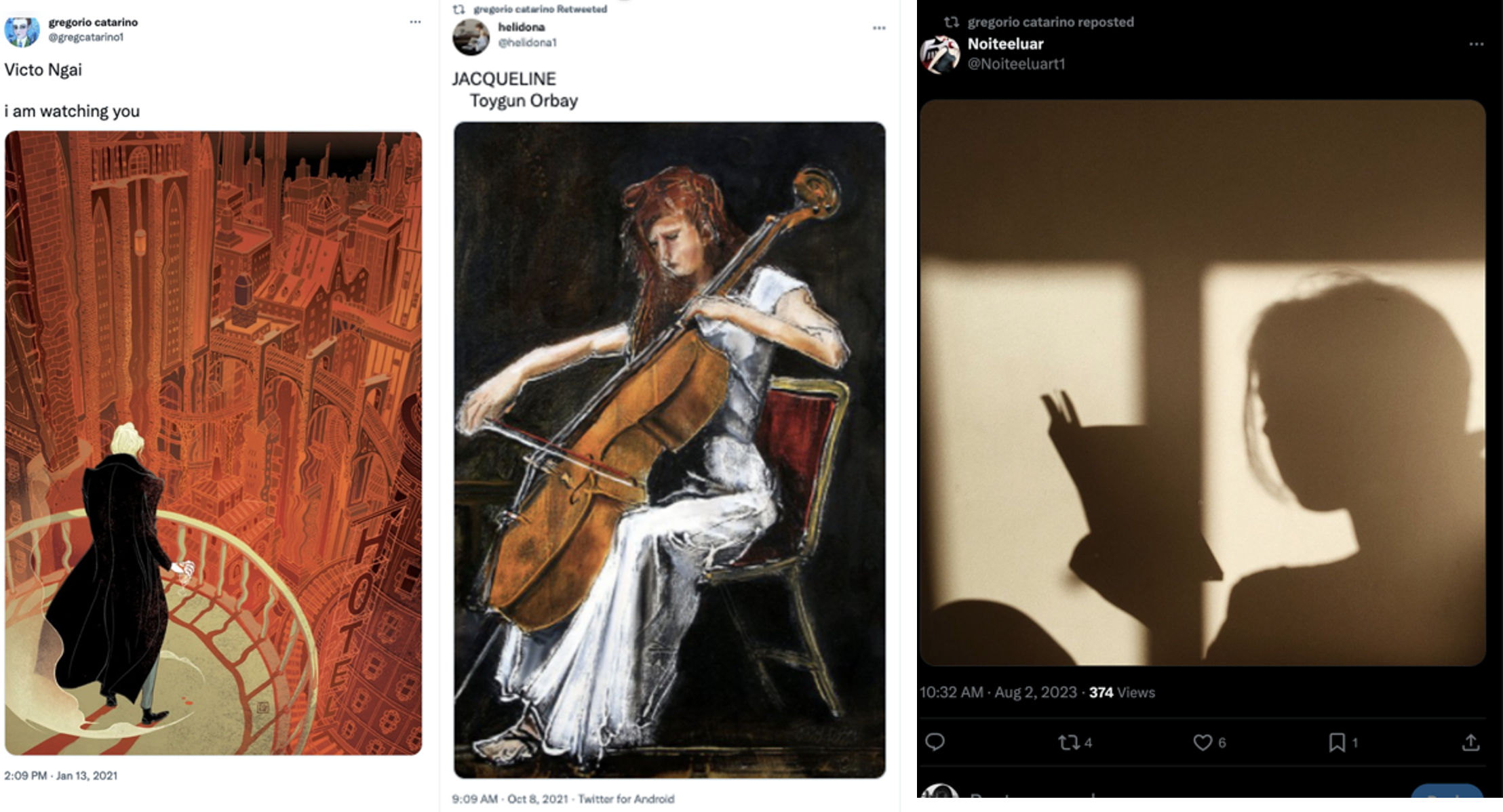 Another repost highlighted an image captioned with my name, “JACQUELINE,” beside a painting of a woman with a cello, which I had been playing at the time. A further repost by the account showed what appeared to be a silhouetted figure reading that resembled me; the background suggested it could have been taken outside my residence.