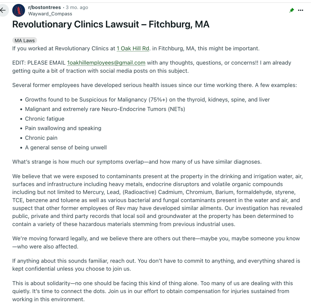 • Property ties: Revolutionary Clinics’ Fitchburg cultivation mill was leased through One Oak Hill, LLC, with the G. Ryan Ansin Irrevocable Trust (2015) listed. Mr. Ansin also served as co-founder and CSO of Rev Clinics and as a CD Services manager. Link