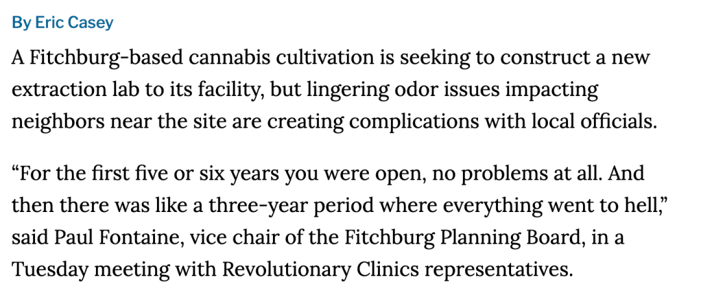 Fitchburg cannabis firm fights odor issues as it seeks approval for renovation. Link here: https://wbjournal.com/article/fitchburg-cannabis-firm-fights-odor-issues-as-it-seeks-approval-for-renovation/