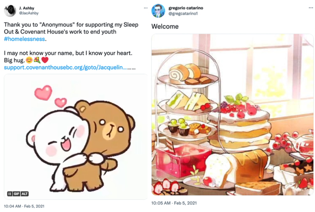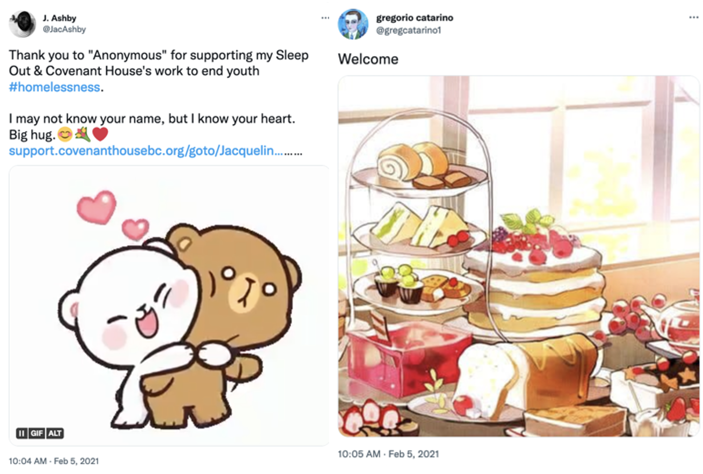 At 10:04 AM on Feb 5, 2021, I thanked “Anonymous” and the @gregcatarino1 account responded at 10:05 AM February 5, 2021 with “Welcome”.