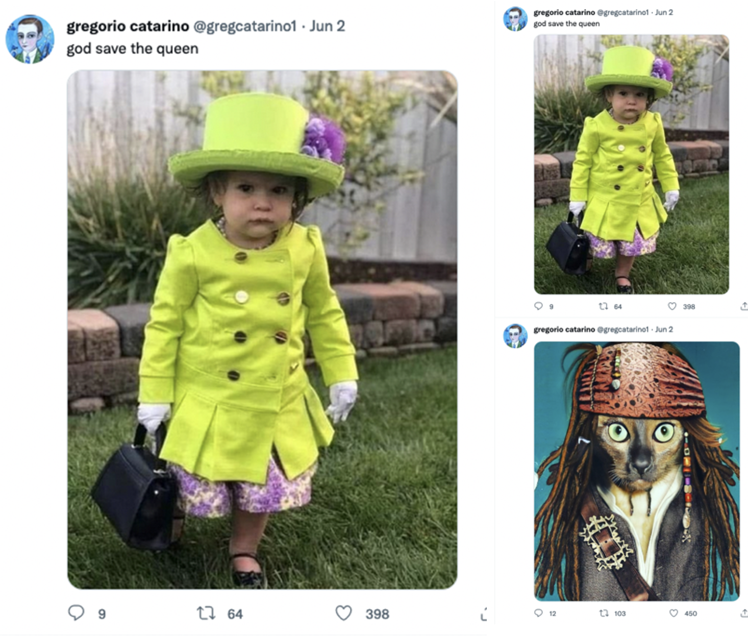 Among the posts on the @gregcatarino1 account were images that appeared to be personal in nature. For example, on June 2 the account posted a photograph of a young child dressed in a bright green outfit with the caption “god save the queen.” In earlier conversations, Mr. Ansin had told me that his wife was expecting a daughter that they later named “Eliza.” Directly beneath the child’s photo, the account shared an image of a cat styled as “Jack Sparrow.”