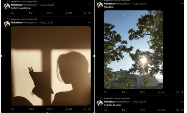 Another feature of the account activity that stood out to me was its pattern of reposting and interacting with other accounts, such as “Noiteeluart1,” and doing so in multiple languages, including Spanish. Posts included phrases like “Señal Intermitente” (intermittent signal), “Atardece” (it grows dark), and “Regresó la señal” (the signal returned). In the context of my experience, these interactions gave me the impression of coded messaging or signaling between accounts.
