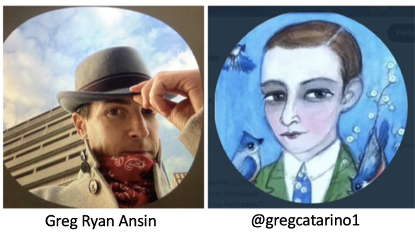 In attempting to confirm for authorities who might be behind the @gregcatarino1 account, I compared publicly available images. On the left is a photograph of Gregory Ryan Ansin taken from his publicly visible Clubhouse profile. On the right is the profile image used by the @gregcatarino1 account.