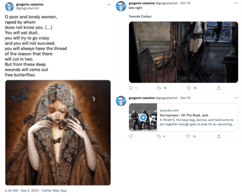 When I compared my TED conversation with Greg Ryan Ansin to the posts on the @gregcatarino1 account, I noticed striking thematic overlaps. In our messages, Greg described living life in “distinct chapters” and “experiencing deeply lots of things.” The Twitter account, in turn, frequently posted about “feeling deeply,” quoting Van Gogh and sharing artwork framed around tenderness and sensitivity.