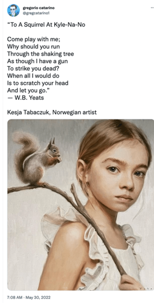 Another recurring theme on the @gregcatarino1 account was violent or disturbing imagery paired with poetry and art. For example, one post included a poem about women, “raped by whom does not know you… you will try to go crazy,” alongside an image of a veiled woman surrounded by butterflies. Another showed a woman leaning against a window in her underwear with the caption “Hit the Road, Jack.” A further post cited W.B. Yeats with the line “As though I have a gun to strike you dead” paired with a portrait of a young girl.