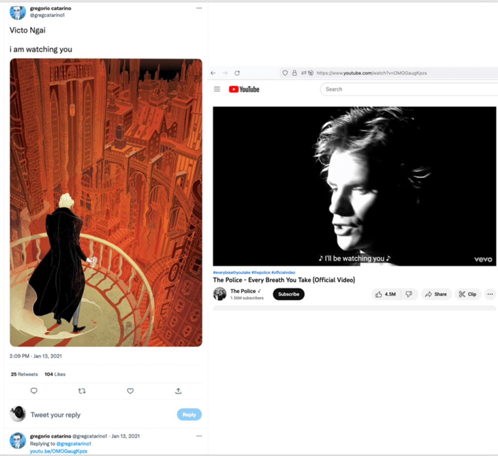 The activity on the @gregcatarino1 account included posts and reposts that, in the context of my experience, felt directed and unsettling. For example, one post paired the phrase “I am watching you” with an illustration of a lone figure looking over a city, alongside the song “Every Breath You Take” by The Police.