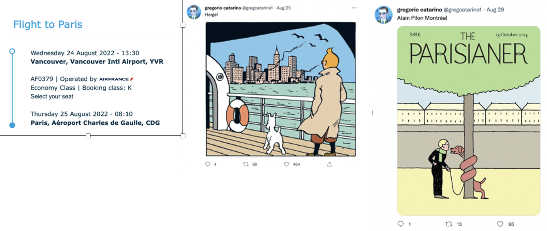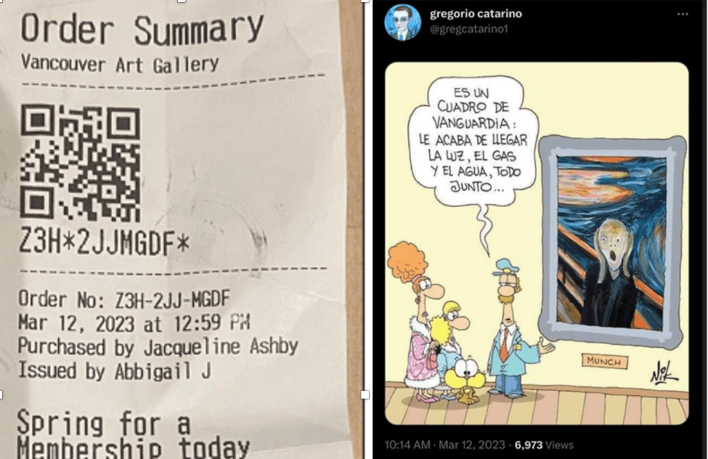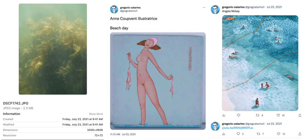 Over time, I began noticing that the @gregcatarino1 account was posting images and art that appeared to echo my own activities. For instance, on days when I took underwater photos or pictures from specific dates, the account posted oceanic or aquatic-themed art. Around the time of my scheduled flight to Paris, it posted illustrations referencing travel and Parisian imagery. Around the time of my visit to the Vancouver Art Gallery, it shared an illustration depicting people touring an art gallery.