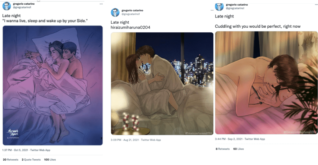 The @gregcatarino1 account also frequently posted sexualized or intimate imagery. Examples included illustrations of couples embracing or in bed, and captions such as “Late night” and “I wanna live, sleep and wake up by your Side.” Some of the women depicted in these posts bore a resemblance to me, which heightened my discomfort.