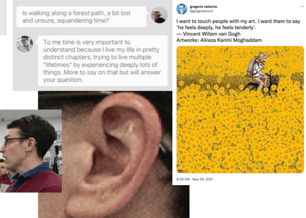 Separately, Greg has a visible scar along his ear. The account’s profile image and some posts referenced Van Gogh—the artist famously associated with a self-inflicted ear injury—further echoing this theme.