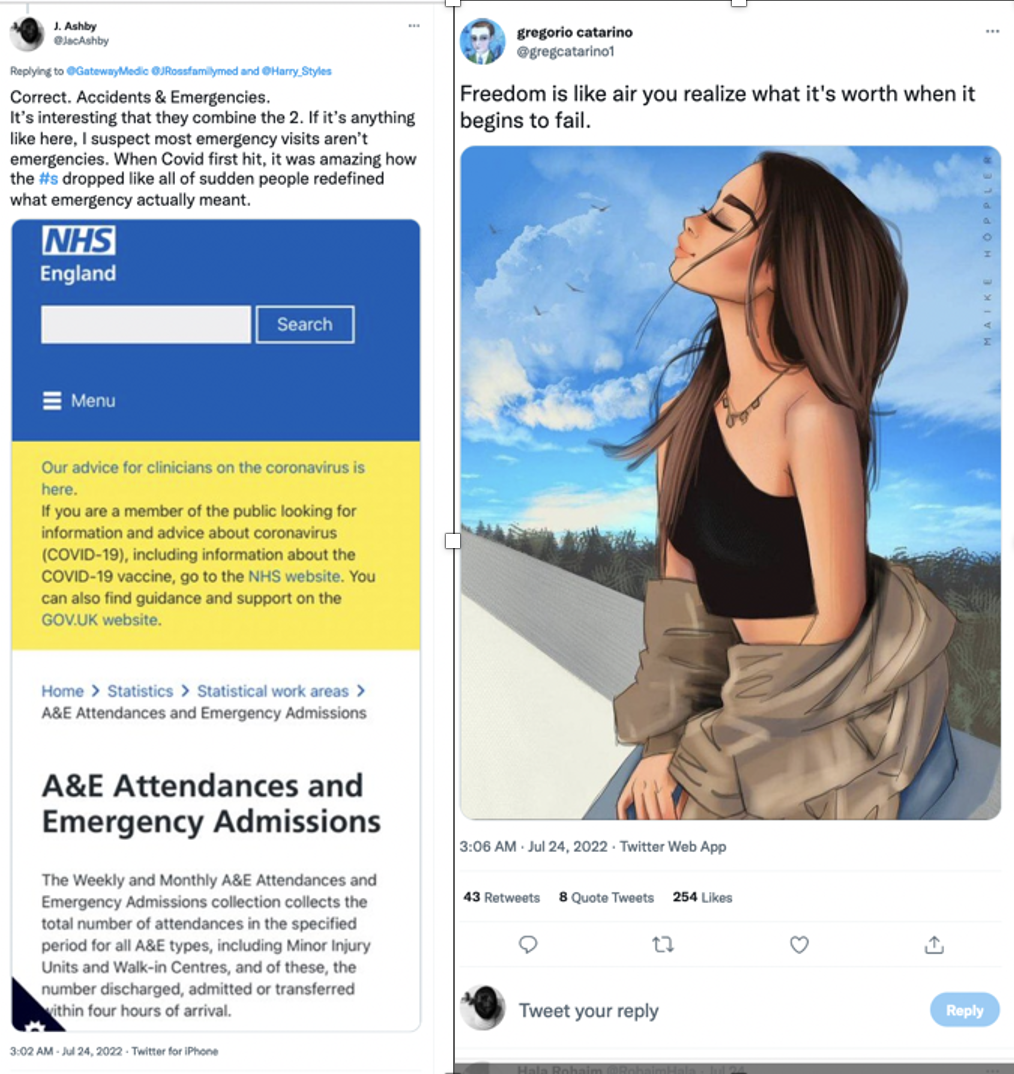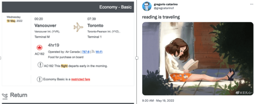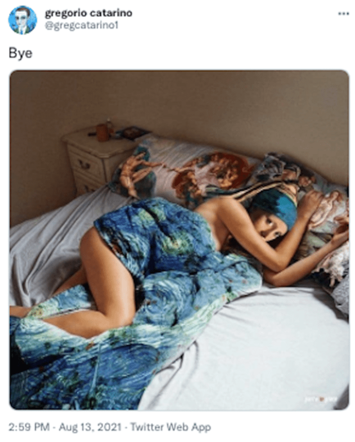 On July 24, 2022, at 3:02 AM, I stepped outside onto my back patio because I was coughing. To timestamp the moment and see if there would be a response, I posted a tweet of my own. At 3:06 AM—just four minutes later—the @gregcatarino1 account posted an image of a young woman resembling me outdoors with her eyes closed, captioned, “Freedom is like air you realize what it’s worth when it begins to fail.”