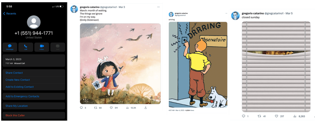 After a series of violent incidents near my home, I relocated. The @gregcatarino1 account then began posting content that, to me, appeared to reference my new location and activities. On March 3, 2023, I received a missed call from a U.S. number. In the context of what had been happening, I interpreted that call as a signal to check the @gregcatarino1 account. When I did, I saw an illustration of a child holding bird postcards—the same type of postcards I had been creating at the time (link here)—captioned with a quote “I’m on my way.”
