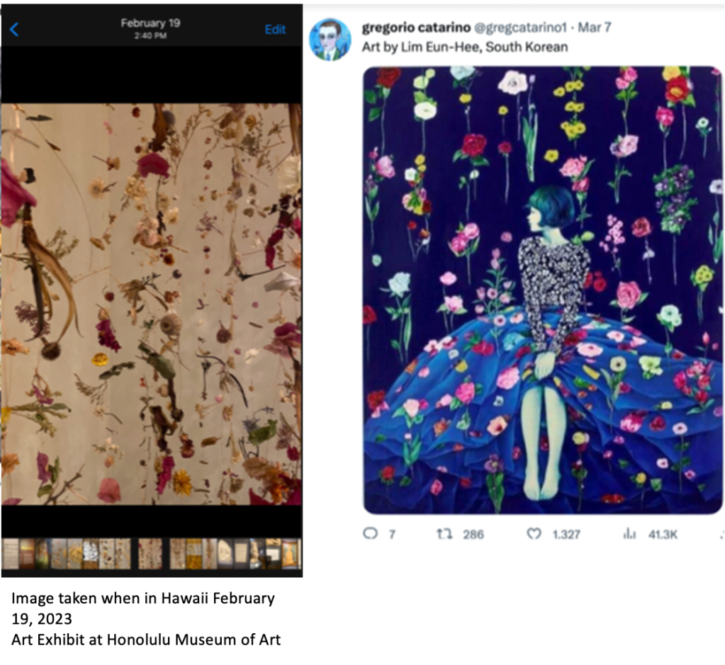 Alongside the timing of these posts, I began noticing something even more unsettling: images and themes from my private life appeared to surface online soon after I had taken or saved them. For example, on February 19, 2023, I photographed an art installation at the Honolulu Museum of Art. Less than three weeks later, the @gregcatarino1 account posted artwork strikingly similar in composition and theme.