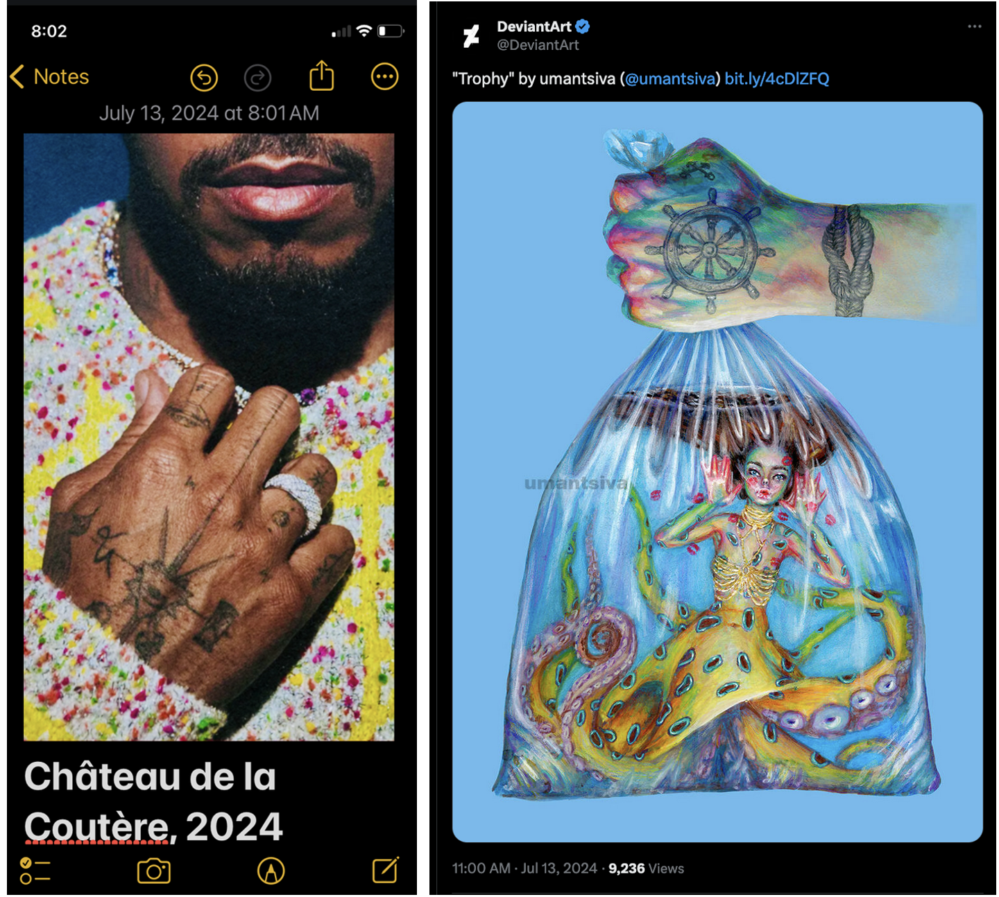 In another instance, a photo saved to my phone on July 13, 2024—showing a distinctive tattoo and nautical motif—was followed the same day, a few hours later, by a DeviantArt post of a drawing featuring an almost identical motif of a hand, a nautical wheel, and a figure submerged in water.