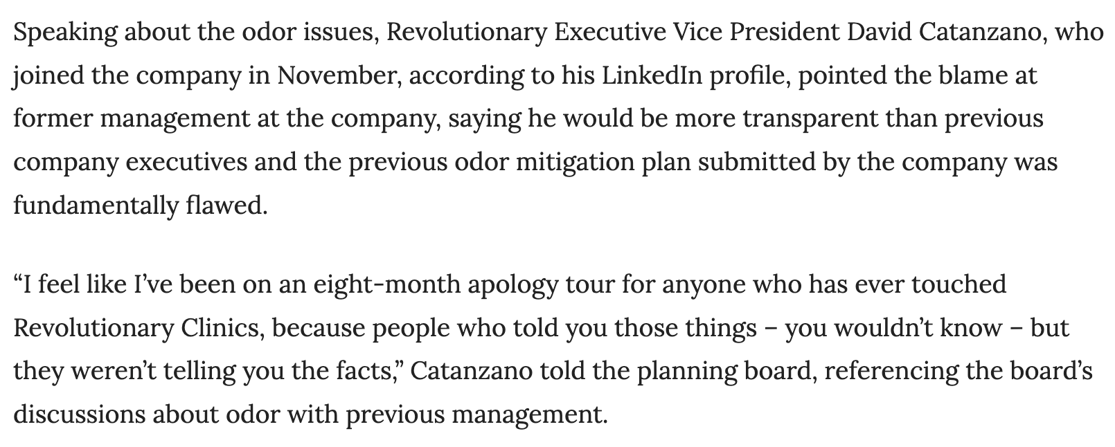 At a public meeting, Revolutionary Clinics’ Executive Vice President David Catanzano admitted that the company’s prior operations and odor mitigation plan were “fundamentally flawed,” blaming former management and describing himself as being on an “eight-month apology tour” because “people who told you those things…weren’t telling you the facts.”