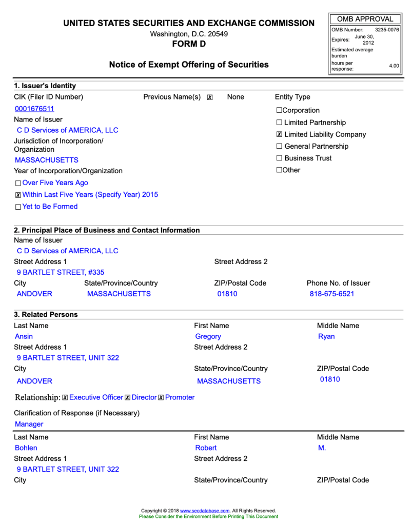 • Management company: At the very same address “9 Bartlet Street, #335, Andover, MA” sat CD Services of America, LLC, the for-profit management company running Revolutionary Clinics. In SEC Form D filings, it classified itself as an “Other Health Care” company (SEC Form D). Officers listed included Robert Bohlen, Lillian Montalto, Tyler Richards (all real estate), and G. Ryan Ansin (SEC Form D).