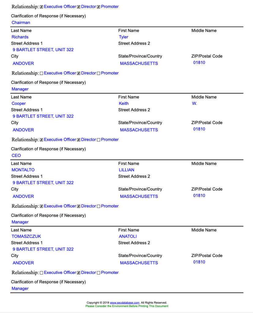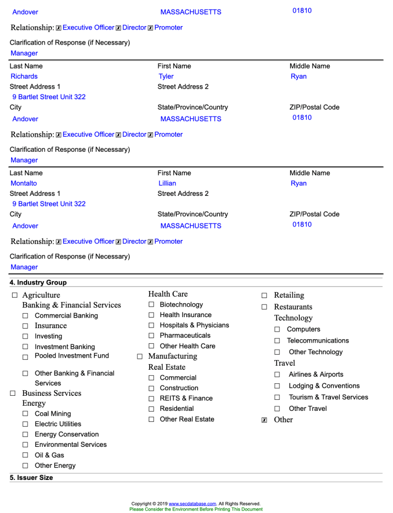 SEC Form D (Filing 2019-07-30). Officers’ middle name changed to “Ryan”: http://pdf.secdatabase.com/2448/0001676511-19-000002.pdf