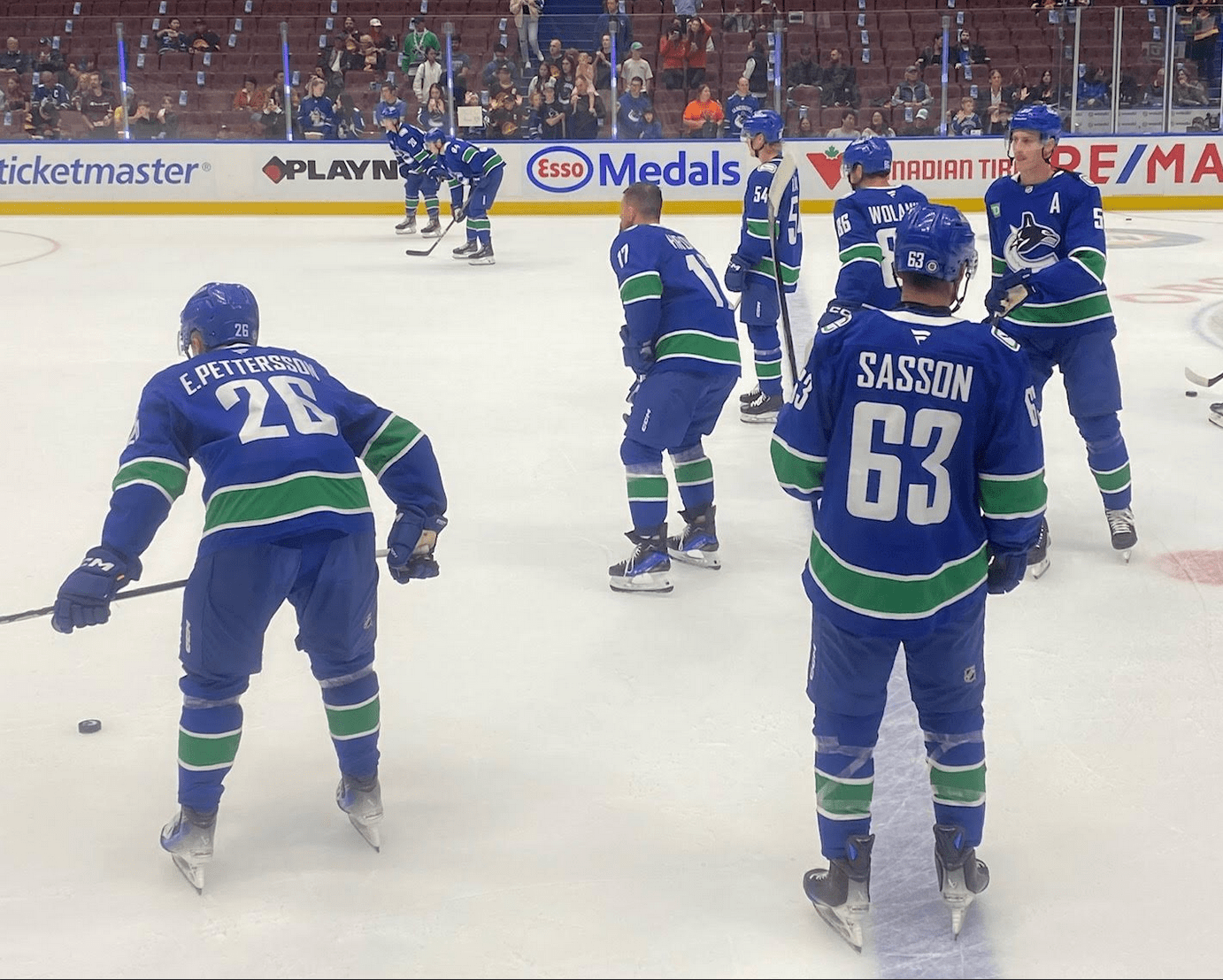 Image of JT Miller and Filip Hronek. Wear your helmet during warm up Hronek… 🙂