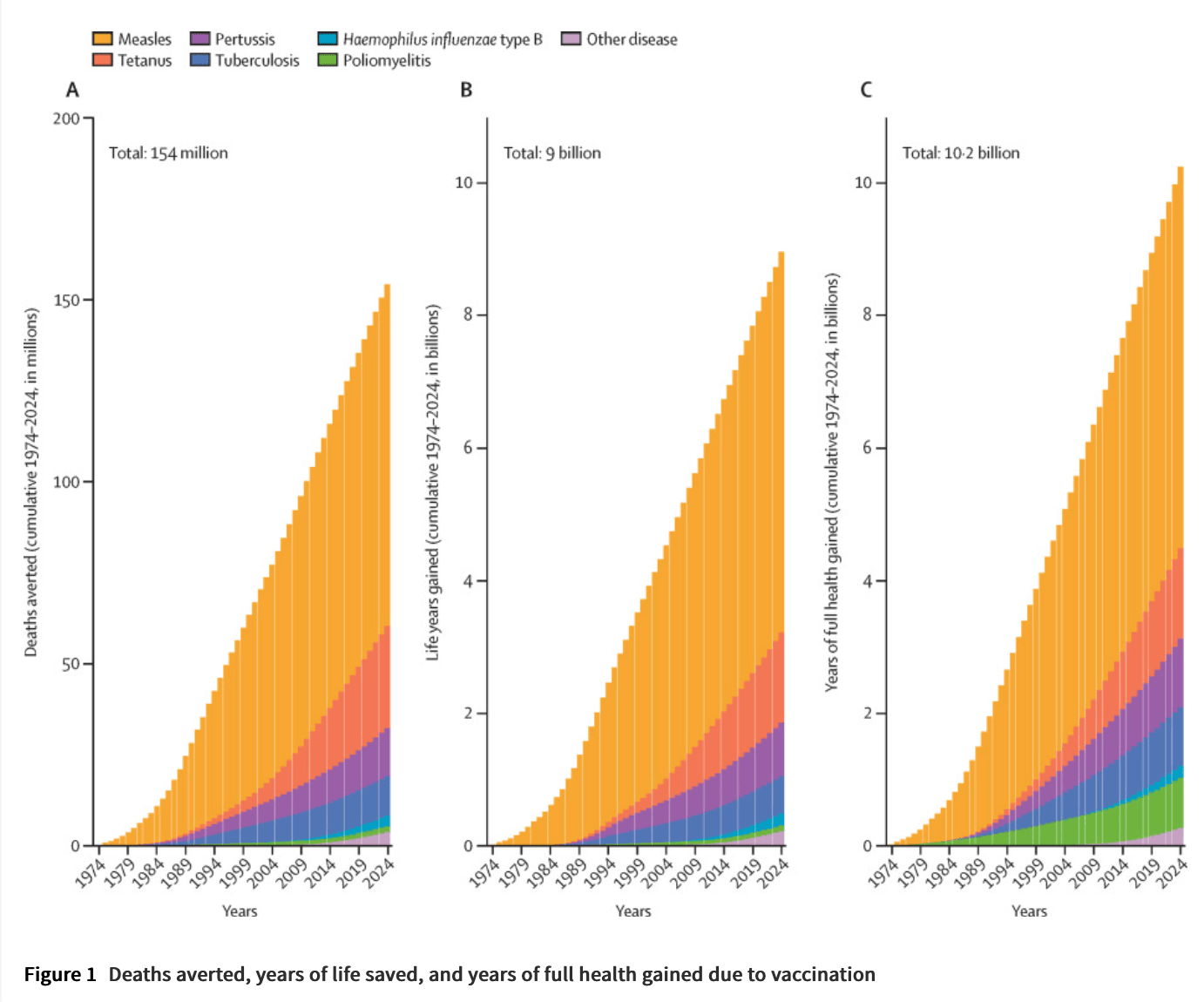 Since 1974 substantial gains in childhood survival have occurred in every global region. We estimate that EPI has provided the single greatest contribution to improved infant survival over the past 50 years. In the context of strengthening primary health care, our results show that equitable universal access to immunisation remains crucial to sustain health gains and continue to save future lives from preventable infectious mortality.