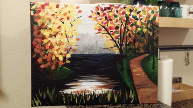 First, I should apologize to my mates because I contracted a serious case of the giggles during our class tonight (it was over 3 hours ). As a result, we had to stay late (30 minutes late) to finish our paintings :). And they look nothing like Leonid’s stunner but I think it can go on a wall. Just not mine. What do you think of this one dad ;)?